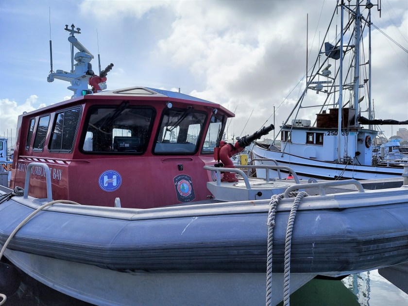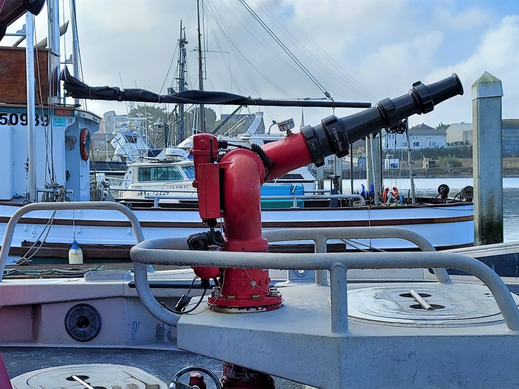 We devoured the few additional snippets of data that this gentleman could provide: The fireboat has only been used occasionally, primarily to support land-based operations. The water stream is taken directly off the turbine propulsion and has a nominal rating of 3,000 US gpm. Since the turbine must be running for the water to flow, the craft can be a little difficult to handle when in use. I bet! Monitor discharge has a range of about 100 ft. The vessel is crewed by a captain and a deckhand, and the local fire department provides a firefighting crew. The output from the the two monitors can be combined into one stream. (I refrained from mentioning why this was not necessarily a good thing. However, I am sure it’s a lot of fun during training.)