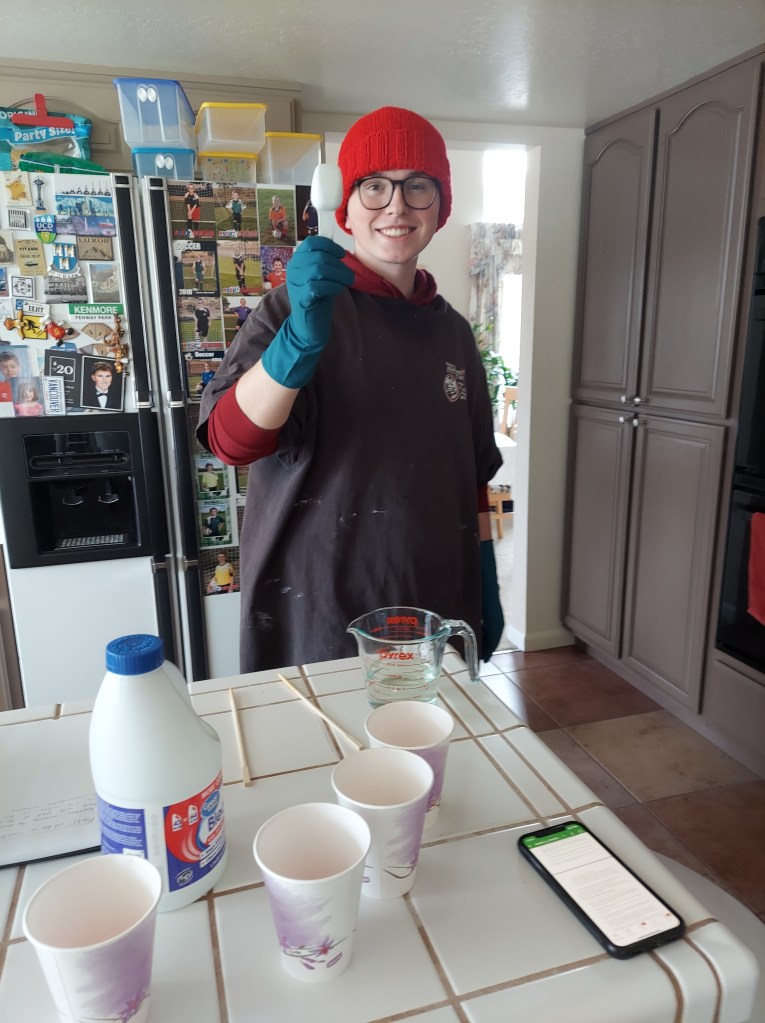 No white lab coat for him; his dad’s old black t-shirt will do the trick. Paper cups have replaced flasks, and chopsticks work as stirrers. His gloves were fetched from the garage. And perhaps his safety glasses (not shown) were once used in boyhood nerf wars.