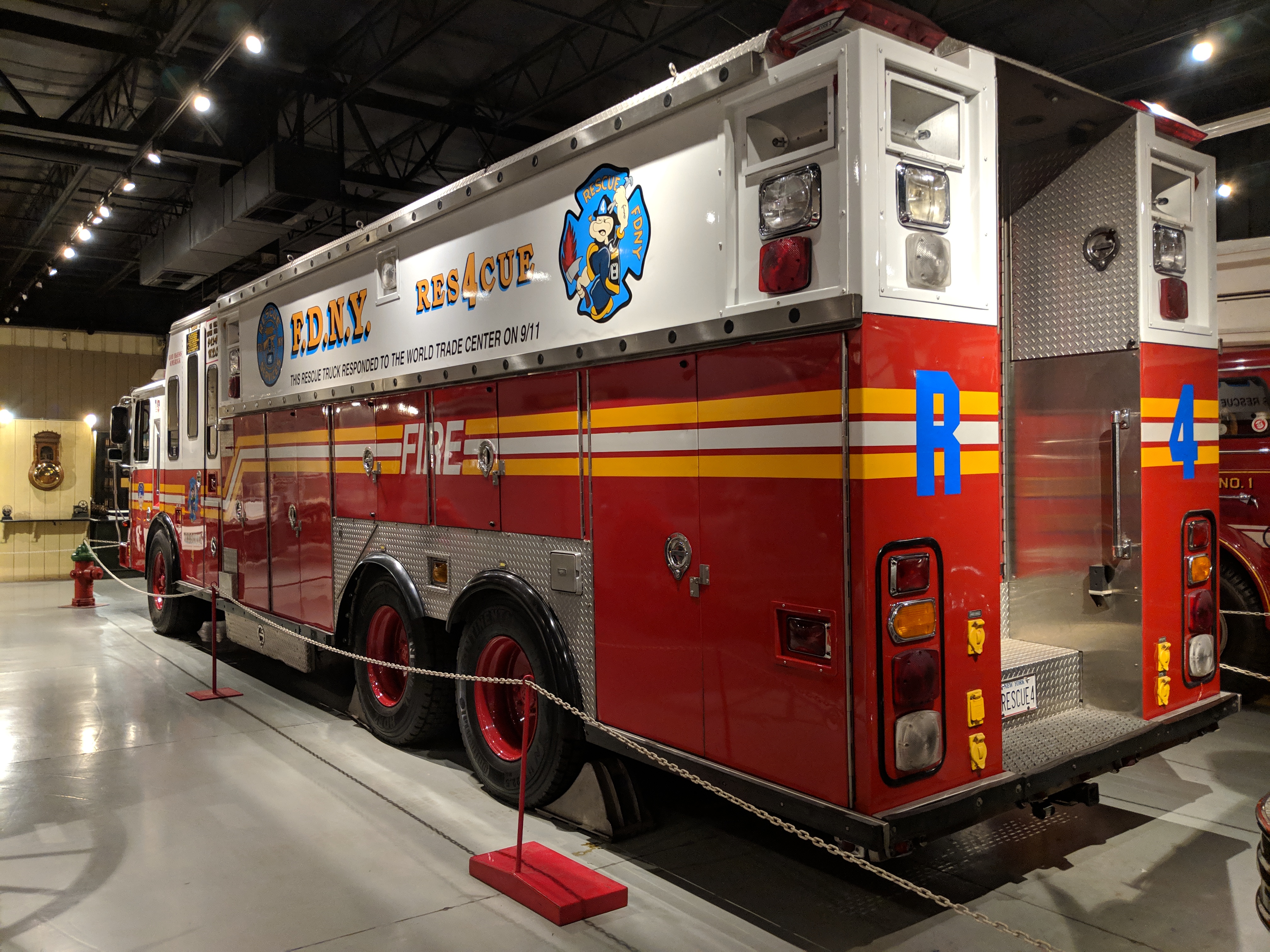 Displays include the prosaic, but historically significant, Rescue Truck 4 which was damaged during 9/11, but returned to service after repair. It was retired in 2010. All eight members of Rescue 4 Company were lost on 9/11.